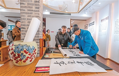 書(shū)法老師在嘉定書(shū)館現(xiàn)場(chǎng)書(shū)寫(xiě)。(樂(lè)廣傳媒供圖)