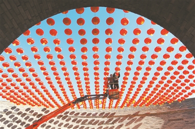春節(jié)臨近,年味漸濃。2月2日,山東省青島市即墨古城張燈結(jié)彩,營造喜慶祥和的節(jié)日氛圍,迎接新春佳節(jié)的到來。圖為工人在即墨古城懸掛燈籠。梁孝鵬 攝