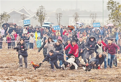 重慶市豐都縣包鸞鎮(zhèn)鄉(xiāng)村趣味運(yùn)動會2月7日在花地堡村舉辦。挑糧接力、趕鵝捉雞、徒手抓豬等鄉(xiāng)土趣味項目輪番上陣,村民和游客在趣味競技中感受濃濃的家鄉(xiāng)年味與新春喜悅。圖為趣味運(yùn)動會活動現(xiàn)場。熊波 攝