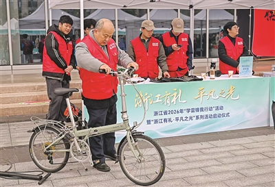 踏腳扳手、龍頭專用扳手、打氣筒……2月28日,浙江省2026年“學(xué)雷鋒我行動(dòng)”暨“浙江有禮·平凡之光”系列活動(dòng)啟動(dòng)儀式現(xiàn)場,全國道德模范、杭州退休公交車駕駛員孔勝東帶領(lǐng)志愿者擺起修自行車公益攤位。攤位上,20余件修自行車專用工具整齊排列,仿佛訴說著他四十年如一日學(xué)雷鋒做志愿者的故事。