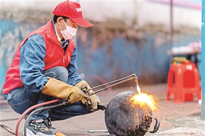 廣西柳州志愿者在“雷鋒街市”為市民焊補(bǔ)鐵鍋。劉興存 袁藝華 攝