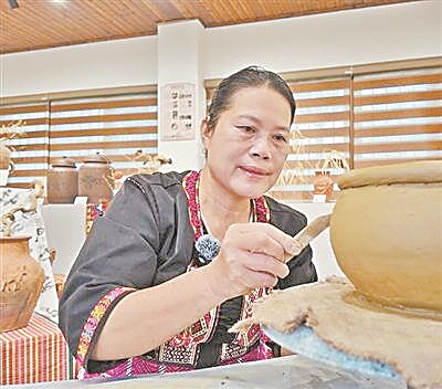 一塊黏土在木案上被反復(fù)揉捏、盤(pán)打,逐漸變得柔韌。工作臺(tái)前,劉梅珍專注地捏制陶器。她笑著給筆者遞過(guò)來(lái)一團(tuán)陶泥:“試試看,感受一下陶泥的手感?!碧漳嘣谑种袧駶?rùn)而厚重,這是海南昌江黎族自治縣保突村特有的高嶺土,黏性好,耐高溫。
